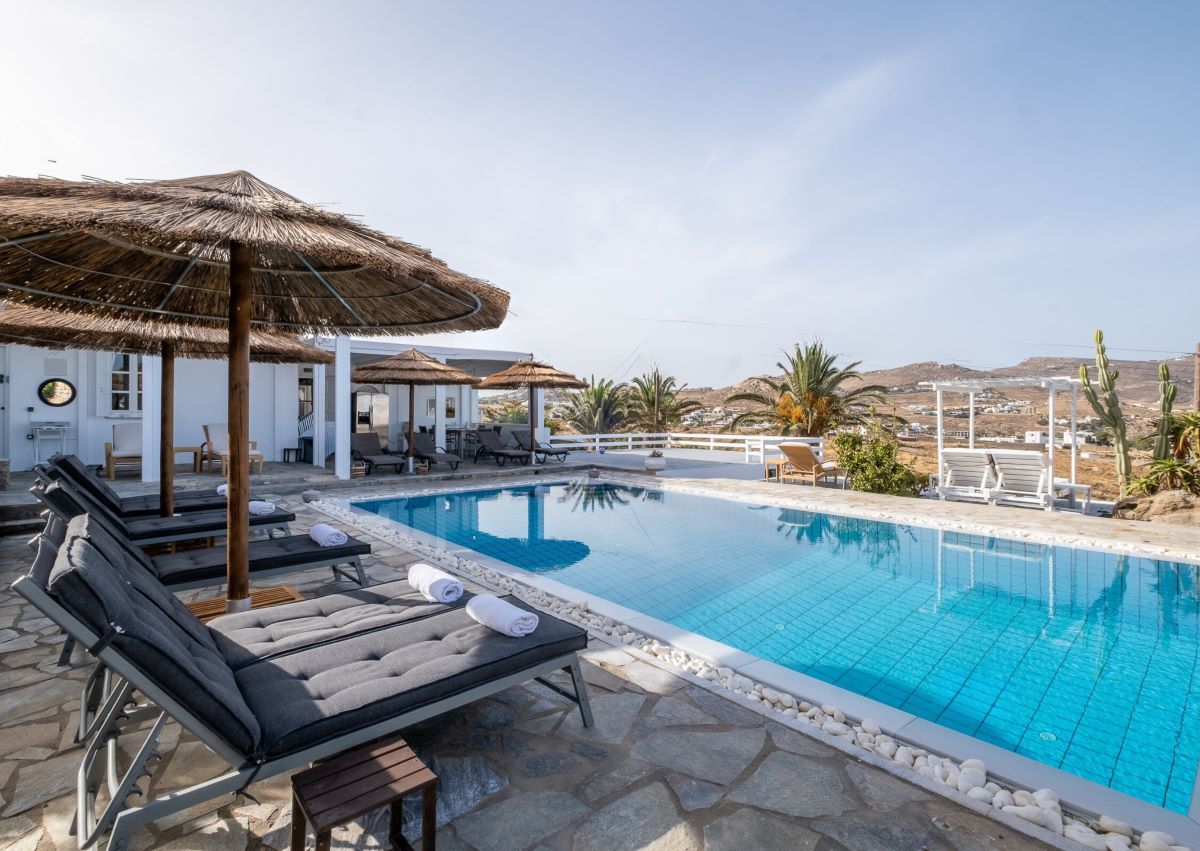 Una galería fotográfica que presenta la opulenta Majestic Manu Mykonos Villa, junto a la playa de Agia Anna, con sus serenos espacios al aire libre, su sofisticada terraza con piscina y sus elementos de diseño orgánico inspirados en Mykonos.